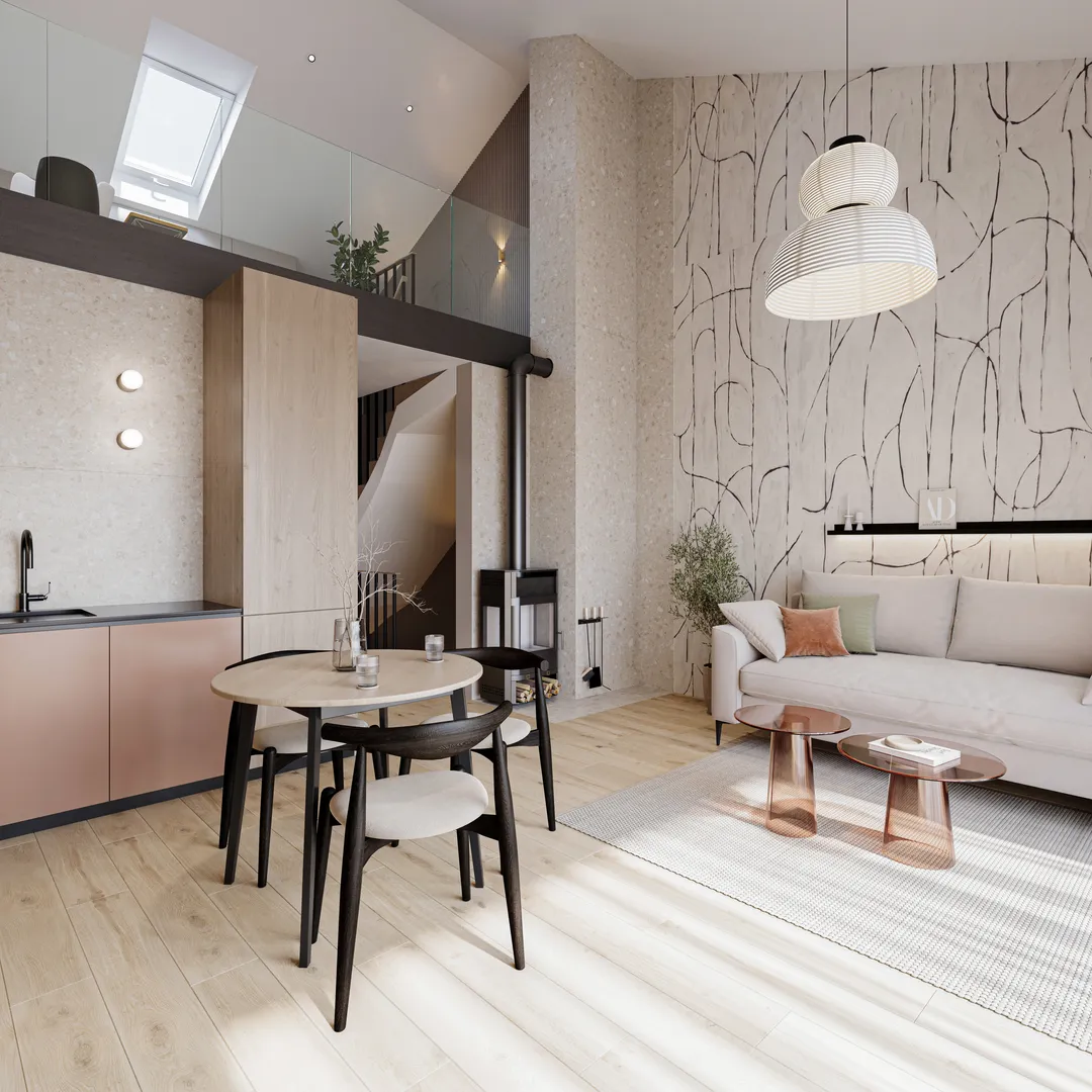 W sześciu wyjątkowych, loftowych mieszkaniach został umieszczony salon z kuchnią, pokój dla dziecka, łazienka, hol, pomieszczenie gospodarcze oraz oddzielna sypialnia na antresoli.